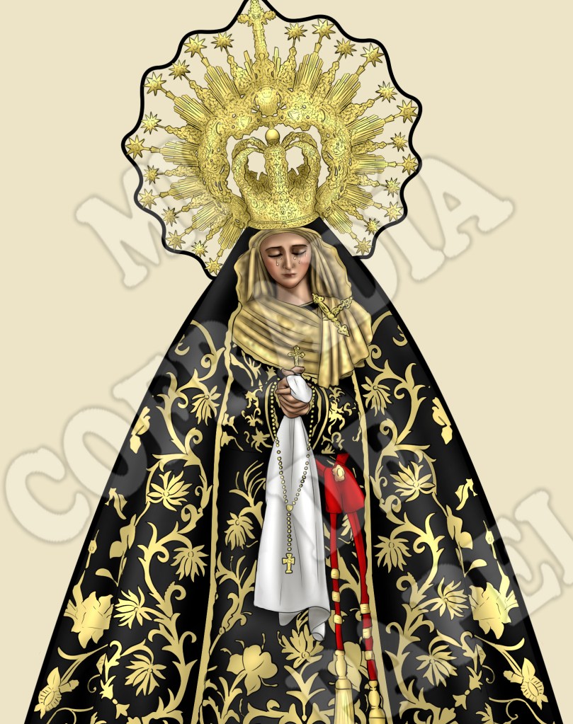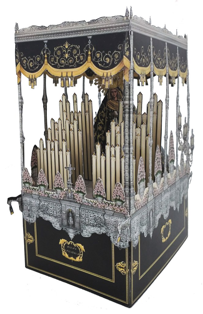Recortable del paso de palio de Mª Stma del Consuelo, titular de la Cofradía del Silencio de Almería. Este recortable refleja una peculiaridad del paso de esta dulce dolorosa, y es que cuenta con diez varales en vez de los doce habituales.