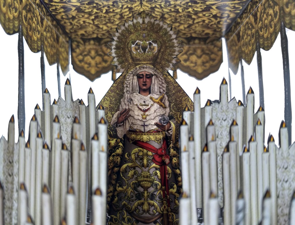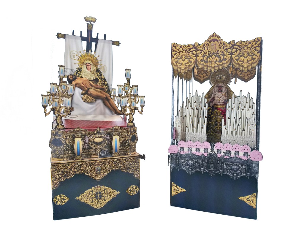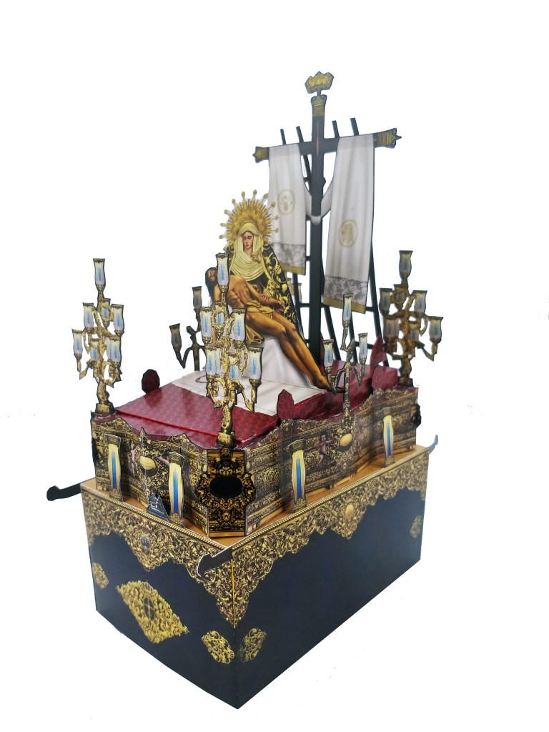 Recortable de la Cofradía del Baratillo de Sevilla. Incluye tanto el paso del conjunto escultórico de la Piedad como el palio de la Caridad en su Soledad.