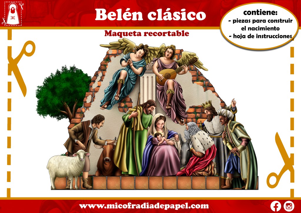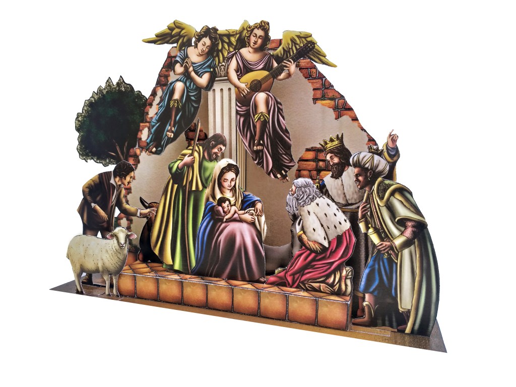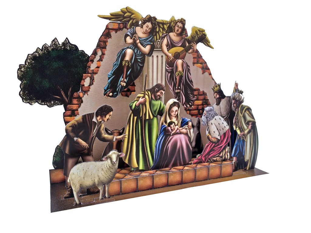 Recortable de nacimiento navideño. Fácil de montar con piezas grandes. Incluyen la Sagrada Familia, mula, buey, los tres reyes magos, un pastor, su oveja y dos ángeles.