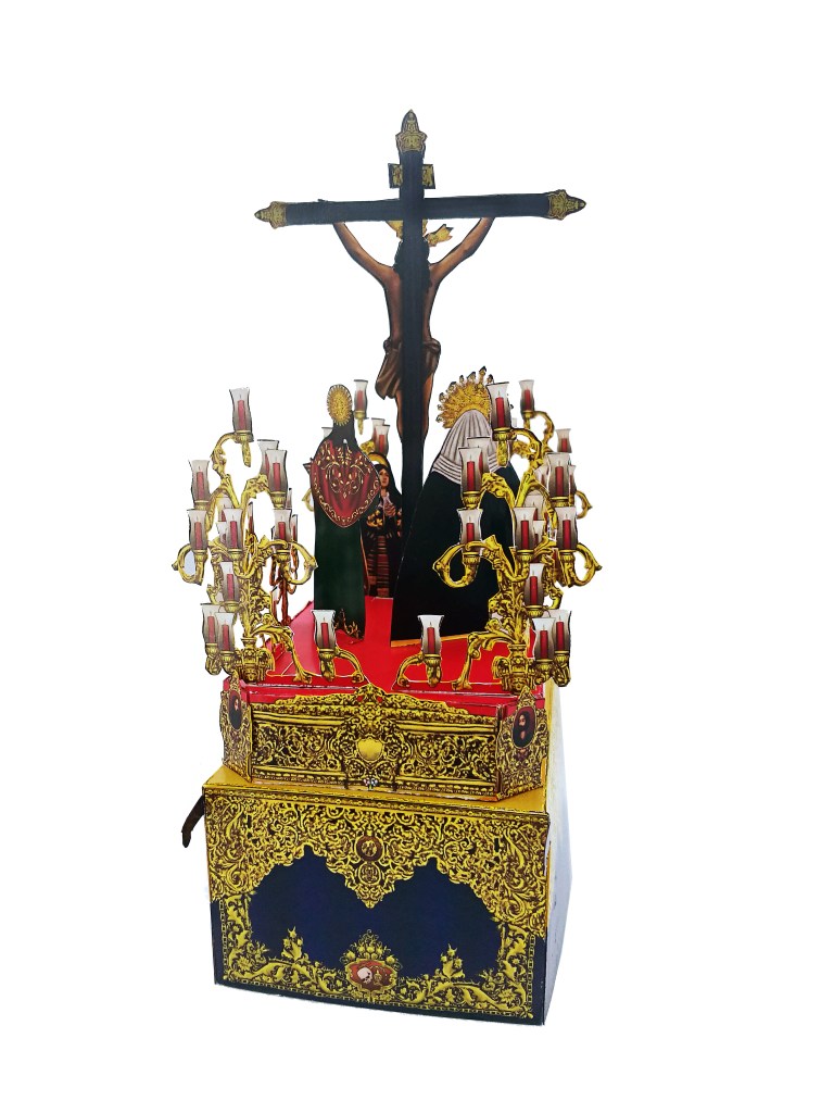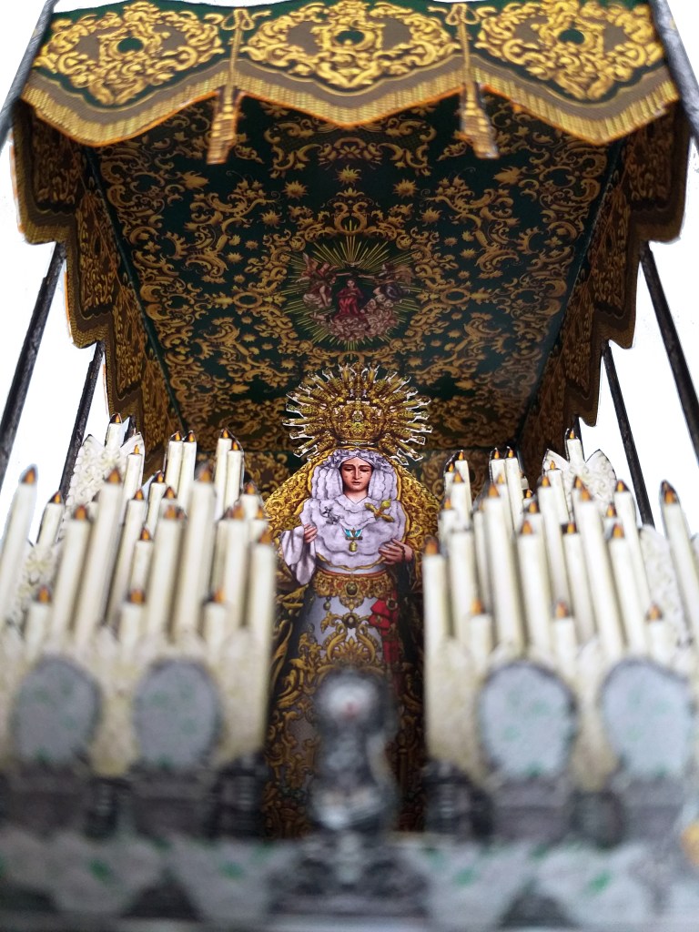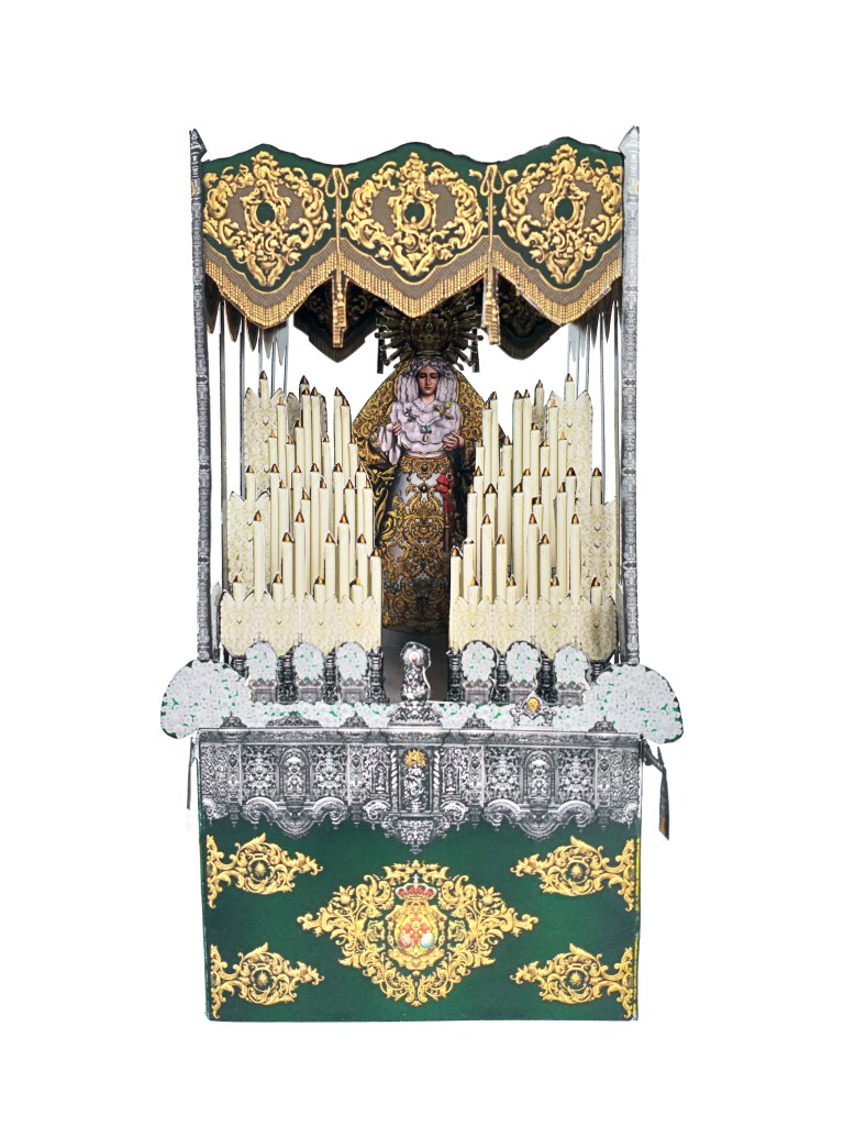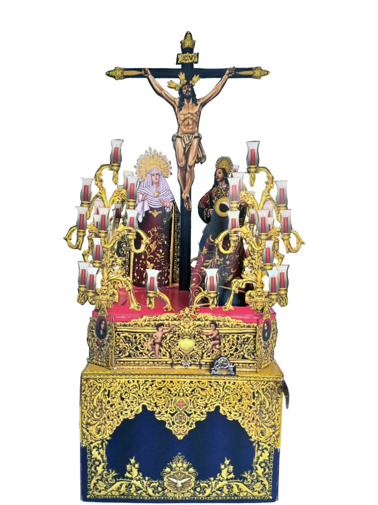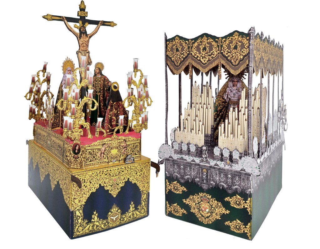 Recortable de la Cofradía de la Esperanza de Huelva. Incluye tanto el paso de misterio de Ntro Padre Jesús de la Expiración como en paso de Palio de Mª Stma de la Esperanza Coronada. Recortable dibujado a mano mediante técnica digital. Impreso a láser en cartulina a doble cara.