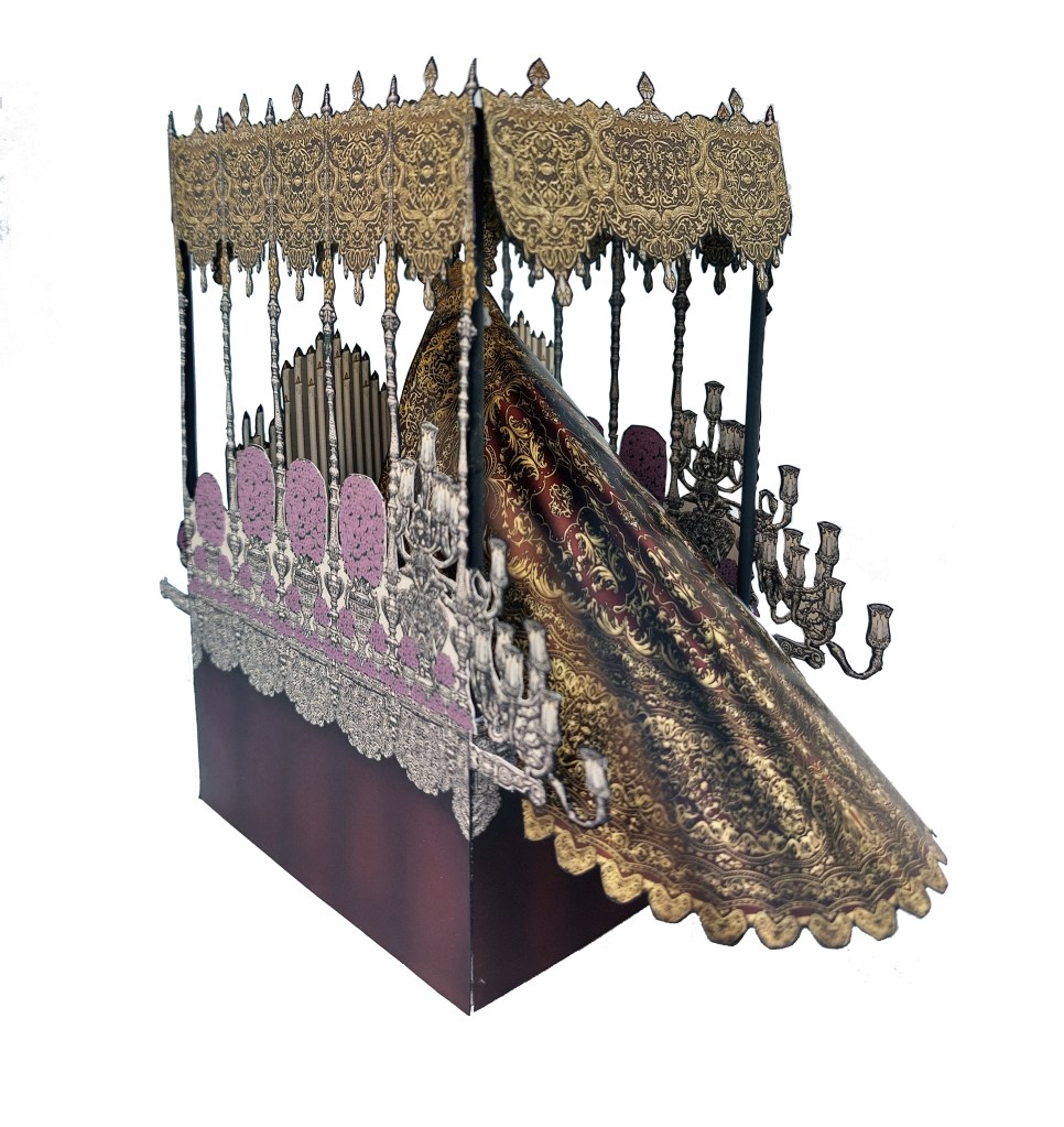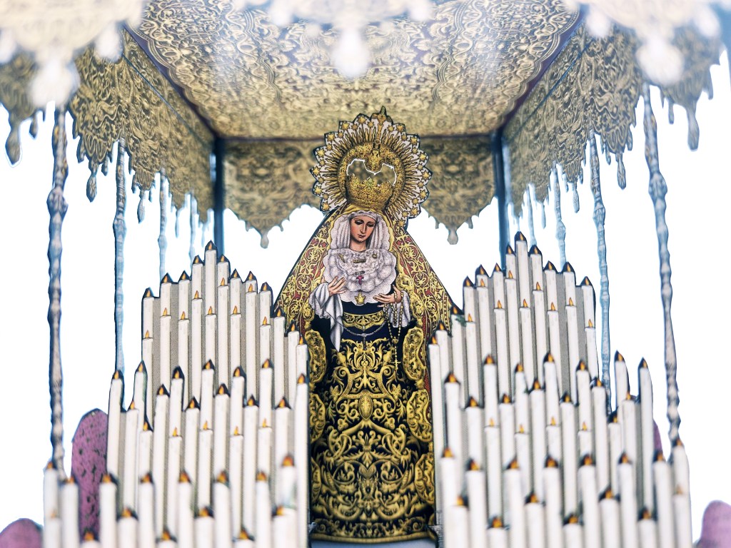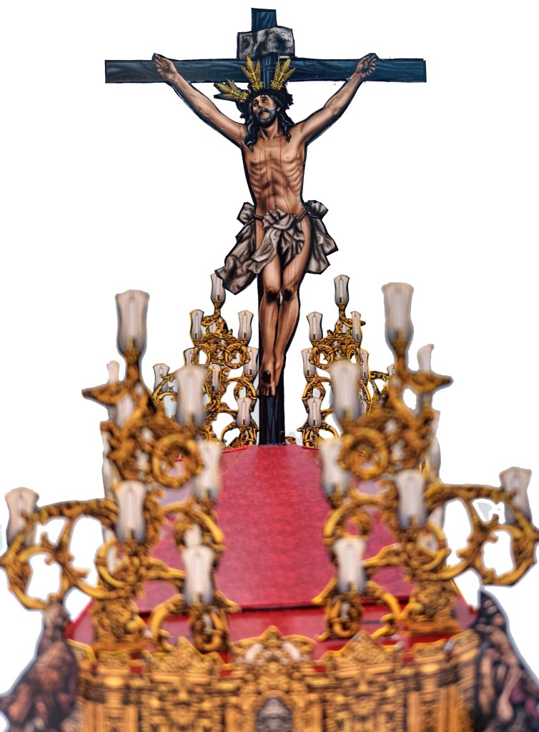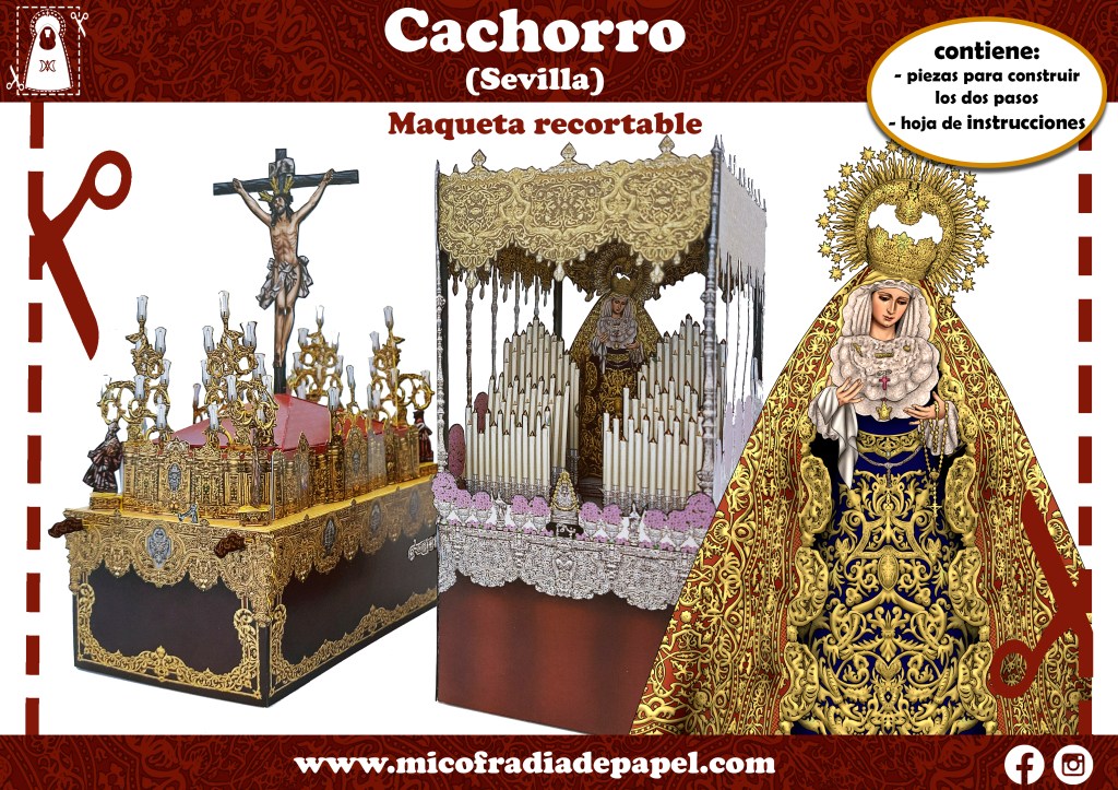 Recortable de la Cofradía de El Cachorro de Sevilla. Incluye tanto el paso de misterio del Stmo. Cristo de la Expiración como el Paso de Palio de Ntra. Sra. del Patrocinio . Recortable dibujado a mano mediante técnica digital. Impreso a láser en cartulina a doble cara.